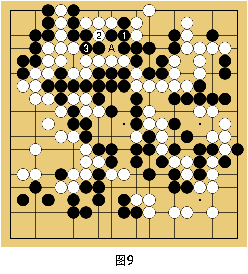 图9:黑1粘时,白若2位挤,黑可3位接,此时白A位不入气,这也是图6中白5必须先接的原因。