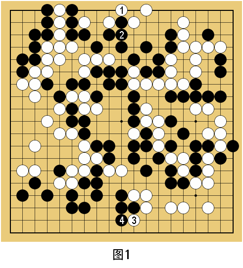 图1:如果仅仅是简单的白1打吃(实战就是这么走的),黑2接上,局部啥棋没有,白3大致去抢下方的大官子,局势仍处于胶着状态。然而,白棋在此隐藏着一击制胜的严厉手段!棋友们能否发现呢?
