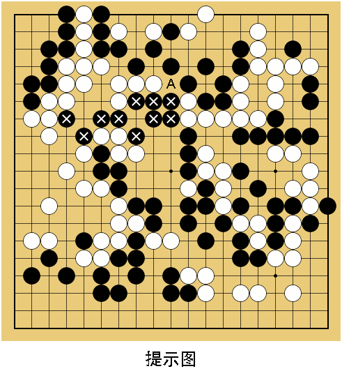 提示图:请仔细观察黑×一串棋子,气非常紧!同时还存在A位的断点。白棋该如何利用这两处弱点,给予黑棋致命一击?
